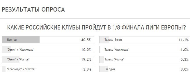 نتیجه نظرسنجی روزنامه اسپرت اکسپرس روسیه درباره شانس صعود سه تیم این کشور در لیگ اروپا به این شرح است: