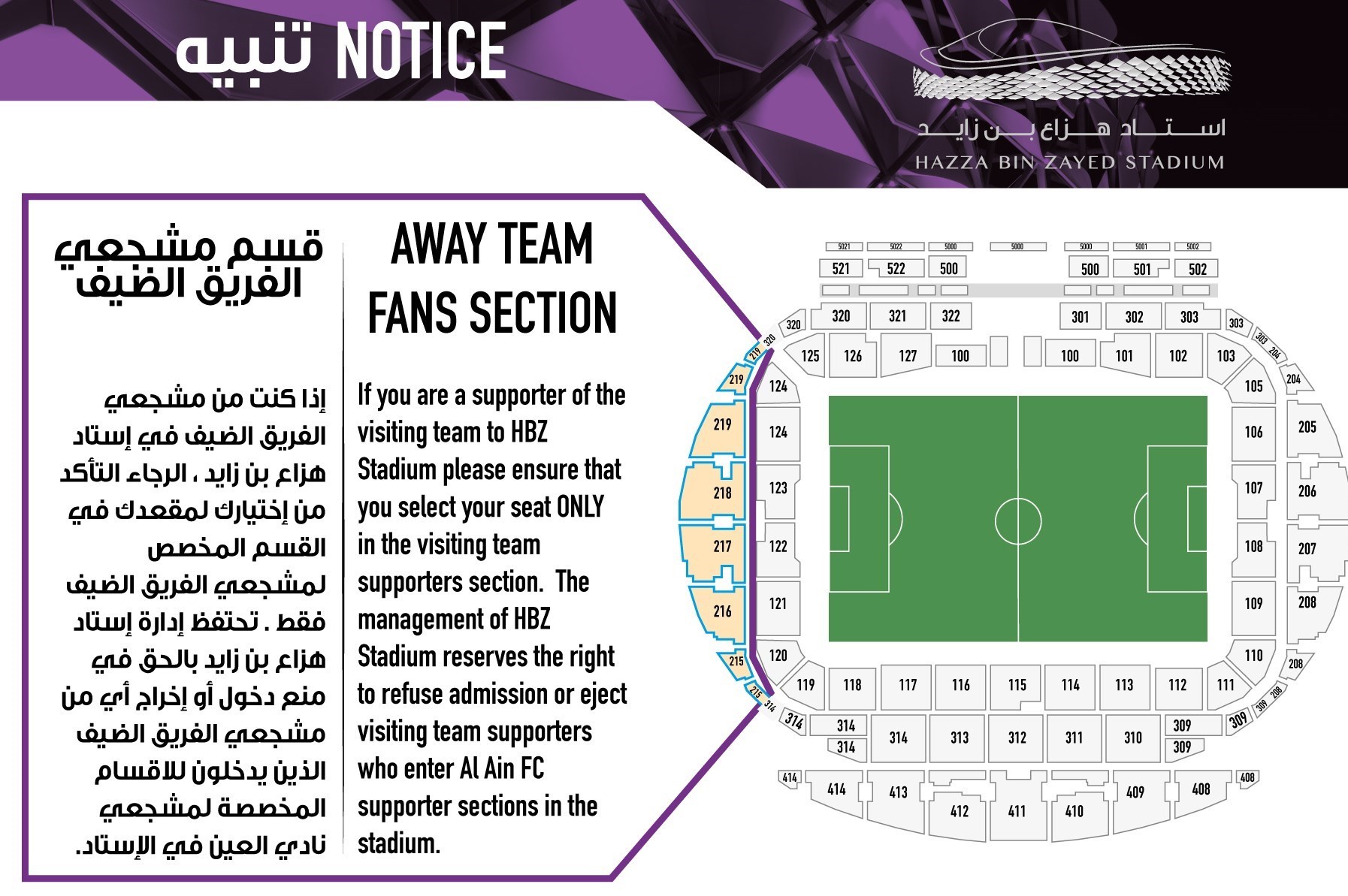 بر اساس اعلام باشگاه العین، جایگاههای شمارههای 215، 216، 217، 218 و 219 به هواداران ذوبآهن تعلق دارد. این باشگاه از هواداران نماینده کشورمان خواست تا تنها صندلیهایی در جایگاههایی را که برای آنها مشخص شده است، انتخاب کنند و در صورت رزرو صندلی در بخشهای متعلق به هواداران العین ممکن است حتی از ورود آنها به ورزشگاه جلوگیری شود.