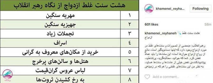 در پست این صفحه آمده است: رهبرانقلاب: «بعضی از تصورات و سنتهای غلط در مورد ازدواج وجود دارد که اینها دست و پاگیر است، مانع از رواج ازدواج جوانها است؛ این سنتها را باید عملاً نقض کرد. شما که جوانید، مطالبهگرید، پرنشاطید، پیشنهادکننده نقض خیلی از عادتها و سنتها هستید، به نظر من این سنتهای غلطی را هم که در زمینه ازدواج وجود دارد، بایستی شماها نقض کنید.»