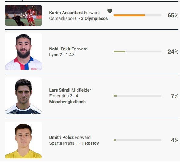 پس از کریم انصاریفرد، نبیل فکیر (لیون فرانسه)، لارس استیندل (مونشنگلادباخ) و دیمیتری پولوز (روستوف) در ردههای دوم تا چهارم قرار گرفتند. کریم انصاریفرد با کسب عنوان برترین بازیکن در دیدارهای برگشت یکشانزدهم نهایی لیگ اروپا عنوان تاریخی در اولین حضورش در این رقابتها رقم زد.