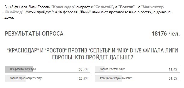در این نظرسنجی 4 گزینهای صعود مشترک تیمهای روستوف و کراسنودار به مرحله یکچهارم نهایی لیگ اروپا با آرای 33.4 درصدی روبرو شد. گزینه صعود فقط تیم روستوف آرای 11.4 درصدی هواداران فوتبال روسیه را به دست آورد. 23.7 درصد شرکتکنندگان در نظرسنجی روزنامه اسپرت اکسپرس به گزینه فقط صعود تیم کراسنودار رای دادهاند. حذف مشترک تیمهای روستوف و کراسنودار نیز با آرای 33.7 مواجه شد.