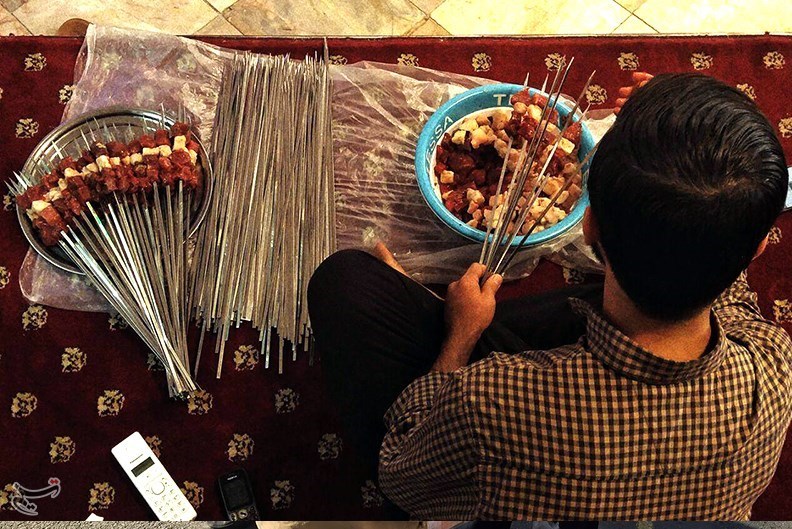 دستکشهای یکبار مصرف را دستش میکند و یکی یکی گوشتهای تکه شده را به سیخ میکشد و کلی تعریف میکند که در کنار قابلی، کبابهای تکه (نوعی کباب افغانستانی) حرف ندارد، میخندد و از سر مزاح میگوید اگر زن بودم شاه کدبانو میشدم با این دستپخت.