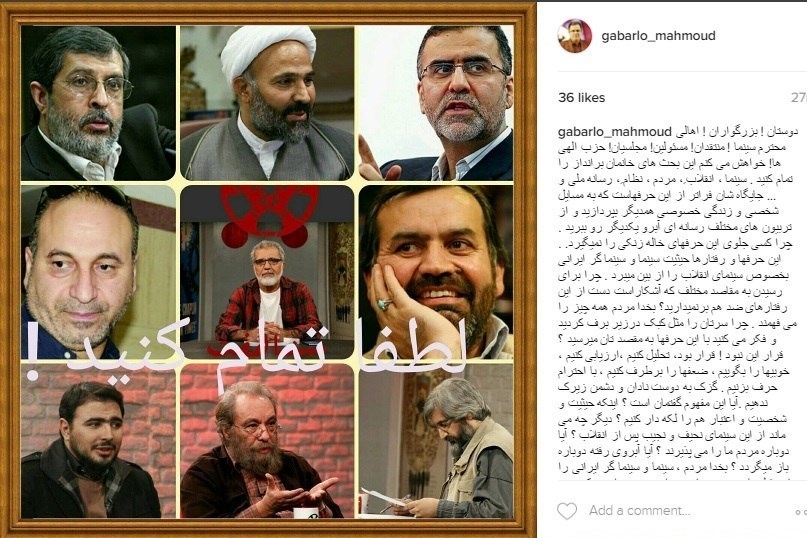 چرا کسی جلوی این حرف‌های خاله زنکی را نمی‌گیرد. این حرف‌ها و رفتارها حیثیت سینما و سینما‌گر ایرانی بخصوص سینمای انقلاب را از بین می‌برد‌. چرا برای رسیدن به مقاصد مختلف که آشکاراست دست از این رفتارهای ضد هم برنمی‌دارید؟ بخدا مردم همه چیز را می‌فهمند . چرا سرتان را مثل کبک در زیر برف کردید و فکر می‌کنید با این حرف‌ها به مقصد‌تان می‌رسید‌؟