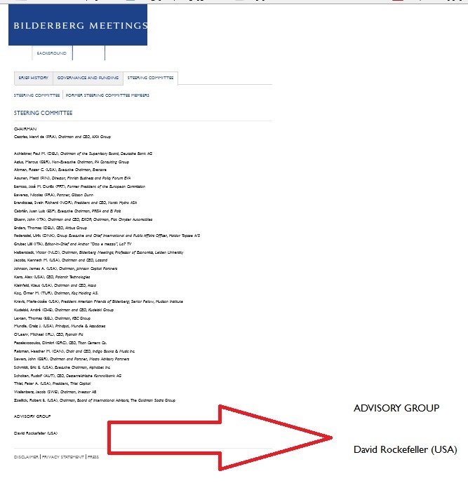 سایت بیلدربرگ، در بخش «کمیته راهبری» {اینجا} پس از برشمردن نام کمیته رهبران بیلدربرگ، جایگاه خاص، ویژه و جداگانهای برای «دیوید راکفلر» درنظر میگیرد و او را مانند تافتهای جدابافته در بخشی مجزا از بقیه رهبران میآورد.