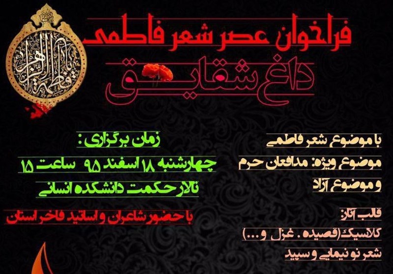 وی برپایی این محفل دانشجویی را بهمناسبت شهادت حضرت زهرا(س) و سوگواری یاس نبوی در فضایی جدید دانست و افزود: علاوه بر دانشجویان و دانشگاهیان، شاعران و اساتید فاخر استان گیلان نیز در عصر شعر فاطمی "داغ شقایق" حضور خواهند داشت.