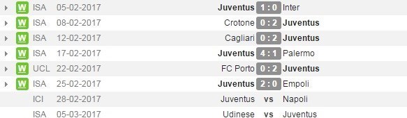 یوونتوس در 6 دیدار اخیر رکورد 6 برد را برای خودش ثبت کرده است. این تیم اینتر را یک بر صفر، کروتونه را 2 بر صفر، کالیاری را 2 بر صفر، پالرمو را 4 بر یک، پورتو را 2 بر صفر و امپولی را 2 بر صفر شکست داده است. همچنین بعد از بازی با ناپولی در کوپا ایتالیا باید در لیگ به مصاف اودینزه برود.