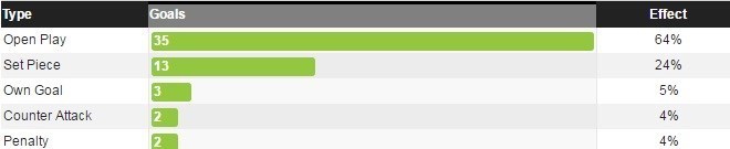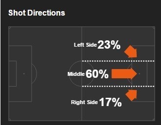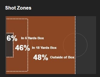 آن‌ها 6 درصد از شوت‌های‌شان را از داخل محوطه 6 قدم، 46 درصد از داخل محوطه جرمه و 48 درصد آن‌ها را از بیرون از محوطه جریمه زده‌اند.
