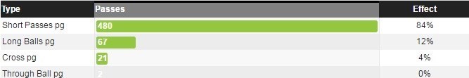 همچنین از 692 پاسی که این تیم داده 610 پاس کوتاه، 58 پاس بلند، 22 ارسال و 2 پرتاب بلند توپ بوده است.