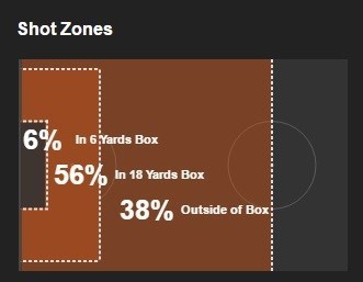 این تیم همچنین 6 درصد از شوت‌هایش را از داخل محوطه 6 قدم، 56 درصد از داخل محوطه جریمه و 38 درصد از بیرون از محوطه جریمه زده است.