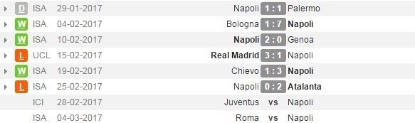 ناپولی اما در 6 دیدار اخیر 3 برد، 2 باخت و یک مساوی به دست آورده است. این تیم بولونیا را 7 بر یک، جنوا را 2 بر صفر و کیوو را 3 بر یک شکست داده، مقابل رئال مادرید 3 بر یک و مقابل آتالانتا 2 بر صفر شکست خورده و با پالرمو یک بر یک مساوی کرده است. بعد از نیمه نهایی کوپا ایتالیا هم باید در لیگ به مصاف رم برود.