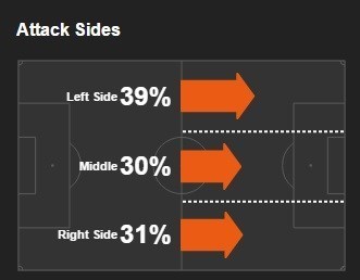 ناپولی 39 درصد از حملاتش را از سمت چپ زمین، 30 درصد از مرکز و 31 درصد آن را از سمت راست ترتیب داده است.