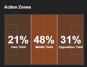 این تیم در بازی‌های فصل جاری 21 درصد از دقایق را در یک سوم زمین خودی، 48 درصد در مرکز زمین و 31 درصد در یک سوم زمین حریف بوده است.