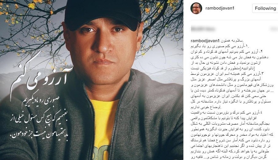 به گزارش گروه رسانه های خبرگزاری تسنیم، رامبد جوان بازیگر و کارگردان سینما، تئاتر و تلویزیون با انتشار پستی در صفحه اینستاگرامش از آرزوهایش نوشت و عنوان کرد: آرزو می کنم صبوری را یاد بگیریم و بفهمیم که هیچ کس مسئول خیلی از بدبختیهامون نیست جز خودمون.