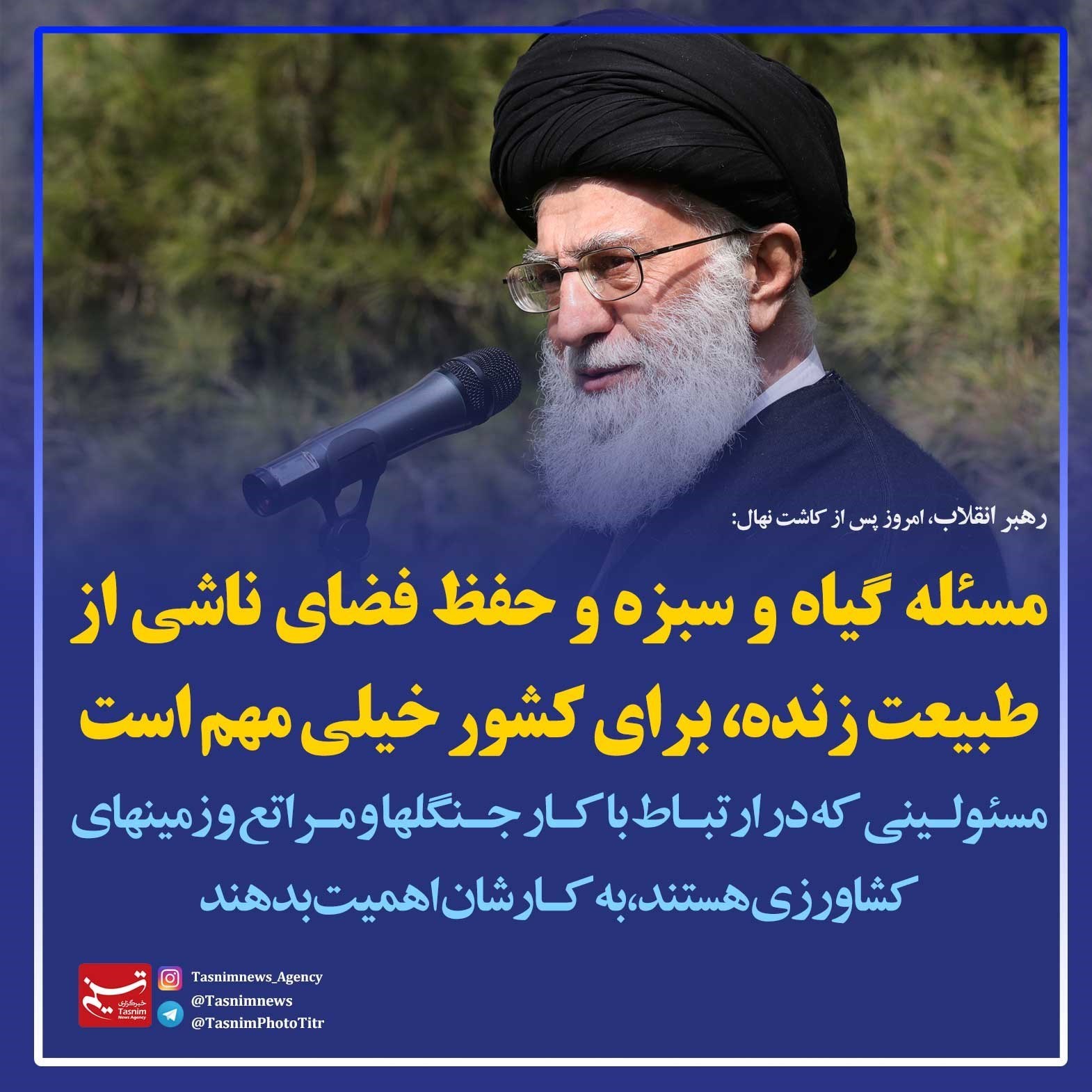 رهبر انقلاب، امروز پس از کاشت نهال: -مسئله گیاه و سبزه و حفظ فضای ناشی از طبیعت زنده، برای کشور خیلی مهم است -مسئولینی که در ارتباط با کار جنگلها و مراتع و زمینهای کشاورزی هستند، به کارشان اهمیت بدهند.