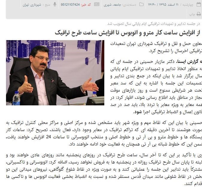 او گفته بود: تا آخر سال، ساعت طرح ترافیک در روزهای پنجشنبه مانند روزهای عادی خواهند بود و البته تا پایان سال طرح ترافیک روزانه در پنجشنبه ها به فروش نخواهد رسید، اتوبوسرانی و تاکسیرانی، مشترکاً باید تدابیر این جلسه را عملیاتی کنند و به صورت ویژه در نقاط شلوغ گلوگاهی، نیروهای میدانی این دو بخش در نقاط شلوغی مانند میدان قُدس مستقر شده و نسبت به انضباط بخشی فعالیت اتوبوس ها و تاکسی ها اقدام کنند.