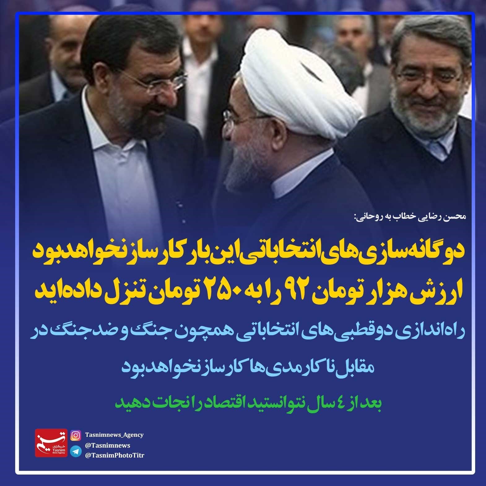 محسن رضایی طی نامه‌ای به روحانی با انتقاد از ناآکارمدی مدیریتی و اقتصادی در دولت وی، هشدار داد راه‌اندازی دوقطبی‌های انتخاباتی همچون جنگ و ضدجنگ در مقابل ناکارمدی‌ها کارساز نخواهد بود.