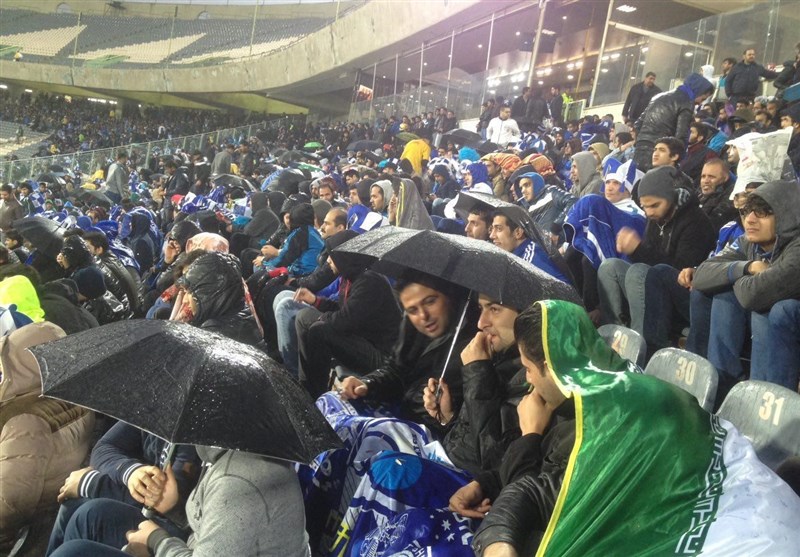* بارش باران شدت گرفته و هواداران به زیر سقف جایگاهها پناه بردهاند.