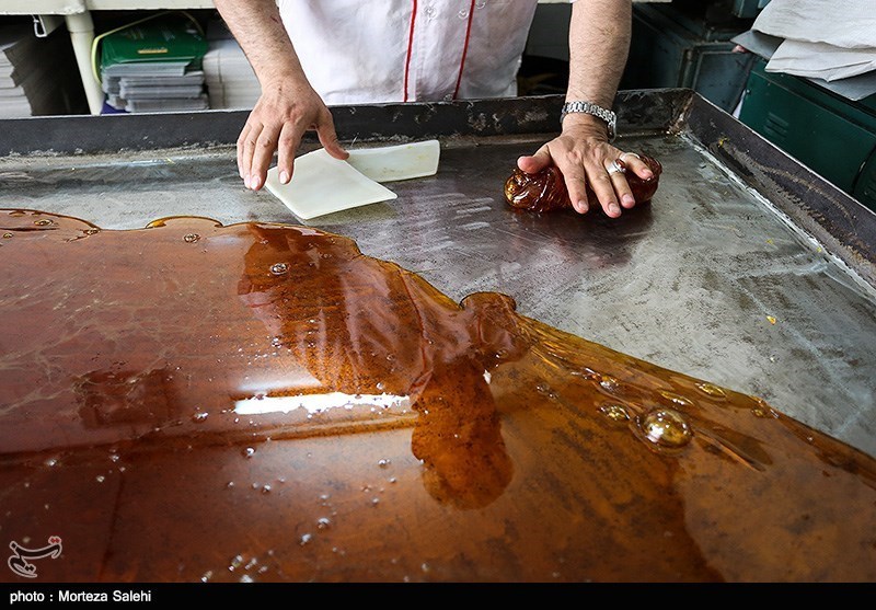 وی ادامه میدهد: مواد جوشانده شده سپس در صفحهای بزرگ مانند سینی ریخته شده و افزودنیهای طعم دار مانند عسل، زنجبیل، لیمو عمانی، نارگیل و غیره به آن اضافه میشود. بعد از اضافه کردن افزودنی طعم دار مواد آنقدر ورز داده میشود تا یک خمیر ایجاد شود. قبل از سفت شدن مواد خمیری از زیر غلطک مخصوص ساخت پولکی عبور میکند و به شکلهای دایره مانند یا بیضی که آن را در فروشگاهها مشاهده میکنیم درمیآید.
