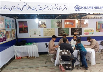 در این غرفه بعضی از محصولات پایگاه اطلاع رسانی دفتر حفظ و نشر آثار حضرت آیتالله العظمی سید علی خامنهای مانند پوستر و اینفوگرافیک توزیع میشود.