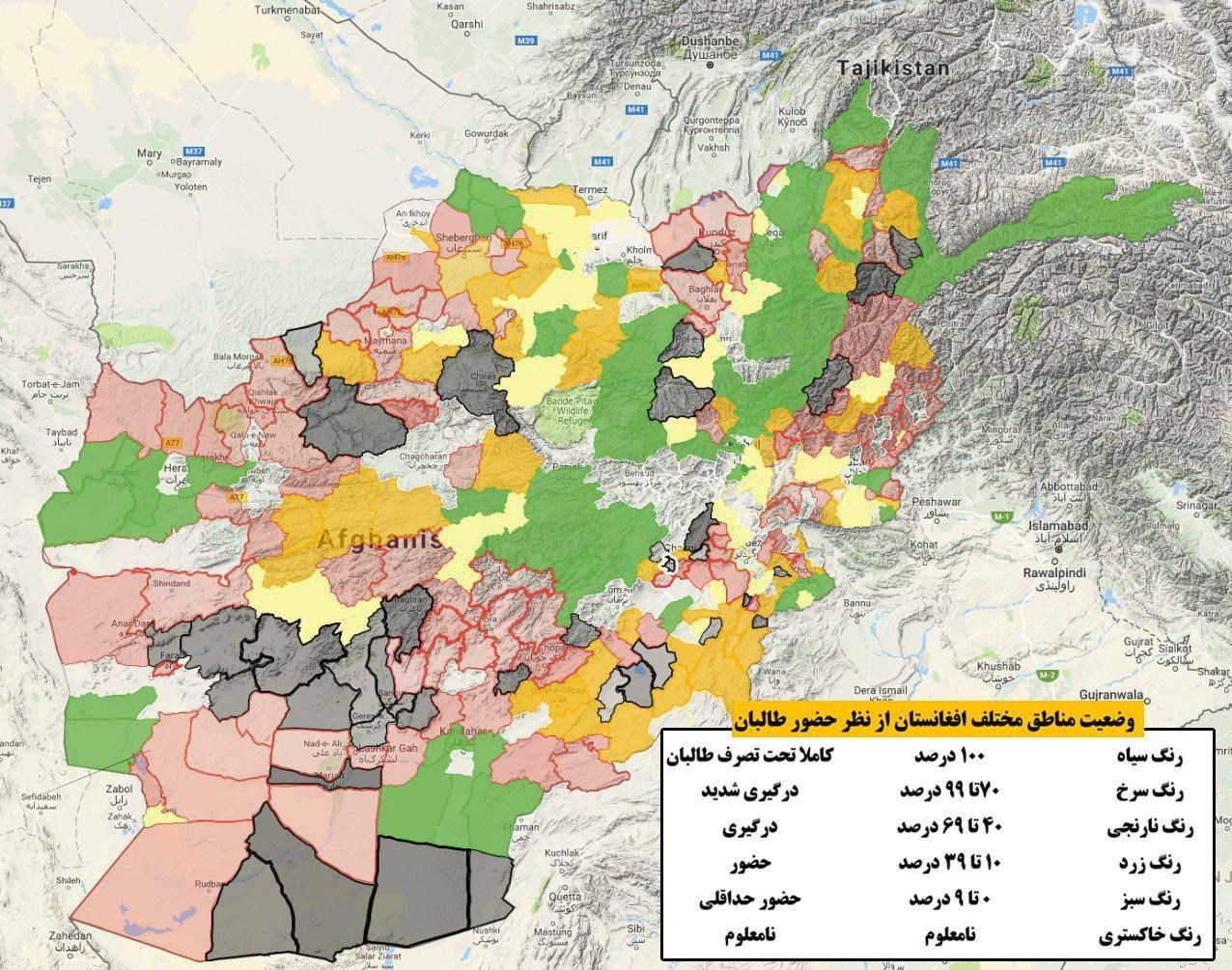 به گزارش دفتر منطقهای خبرگزاری تسنیم، «کمیسیون امور فرهنگی امارت اسلامی» مربوط به طالبان با انتشار نقشهای مناطق تحت کنترل و نفوذ و مناطقی که در آنها با نیروهای دولتی درگیر است را در افغانستان مشخص کرد.