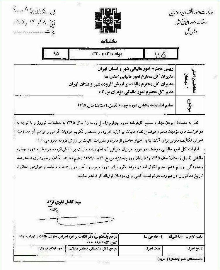 در بخشنامه سازمان مالیاتی آمده است، نظر به مصادف بودن مهلت تسلیم اظهارنامه دوره چهارم (فصل زمستان ) سال 1395 با تعطیلات نوروز و با توجه به درخواست های مؤدیان محترم موضوع نظام مالیات بر ارزش افزوده و به منظور تکریم مؤدیان گرامی و فراهم آوردن زمینه اجرای تکالیف قانونی برای آنان، بنا به اختیار حاصل از قانون و مقررات مالیات بر ارزش افزوده مقرر می دارد: