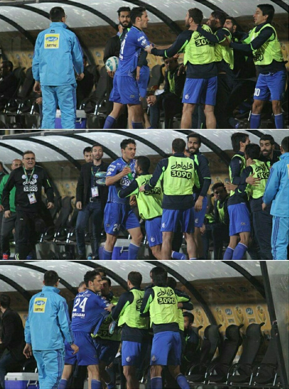 *امید نورافکن، بازیکن تیم استقلال بعد از تعویض شدنش از زمین مسابقه، مستقیم به رختکن رفت و حاضر نشد روی نیمکت بنشیند. پس از اعتراض نورافکن به تعویض شدنش، یعقوب کریمی هم از این رفتار او گلایه کرد. این موضوع باعث به وجود آمدن درگیری میان این دو بازیکن شد. این در حالی بود که منصوریان اخراج شده بود و روی نیمکت حضور نداشت.