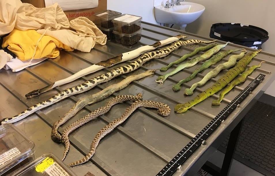 طبق این گزارش 6 مار سمی از نوع Wagler temple -که بومی جنوب شرقی آسیا است-، 3 مار از نوع ball python و دو مار hognose به همراه 9 رتیل (دو رتیل غول کلمبیا، پنج رطیل REDKNEE مکزیکی و دو رتیل صورتی برزیلی) و 4 عقرب آسیایی سرنشینان این جعبه مرگبار بودند.