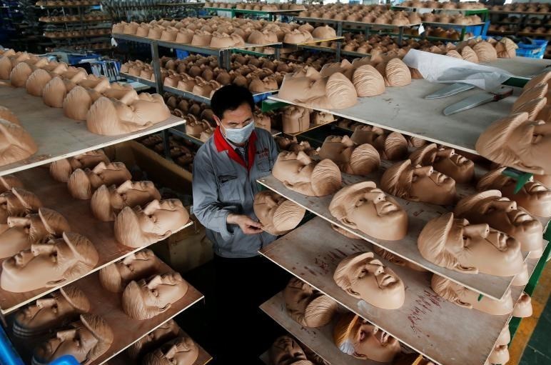 تصویر زیر مربوط به کارخانه تولید‌کننده آثار هنری لاتکسی در چین است که یک کارگر چینی در آن ماسک‌های تولید شده با طرح صورت ترامپ را بازبینی می‌کند.
