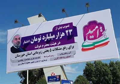 روحانی که حامی بزرگ خود را از دست داده این روزها در بنرها و تابلوهای تبلیغاتی سطح شهرها سرگردان است. وی از تصویب بیش از 23هزار میلیارد تومان اعتبار در هیئت دولت برای رفع مشکلات 5 بخش زیربنایی استان خوزستان از جمله آب و فاضلاب، ریزگردها، فاز دوم طرح 550هزار هکتاری، احیای رودخانه کارون و نیز نوسازی، ترمیم و تجهیز خطوط انتقال برق خبر می‌دهد.