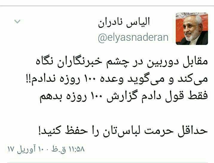 این پاسخ رئیس دولت یازدهم با واکنش متعددی در فضای مجازی رو برو شده است. در یکی از این واکنشها الیاس نادران اقتصاددان و نماینده ادوار مجلس در صفحه شخصی خود در توئیتر نوشت که «مقابل دوربین در چشم خبرنگاران نگاه میکند و میگوید وعده 100 روزه ندادم!! فقط قول دادم گزارش 100 روزه بدهم، حداقل حرمت لباستان را حفظ کنید»