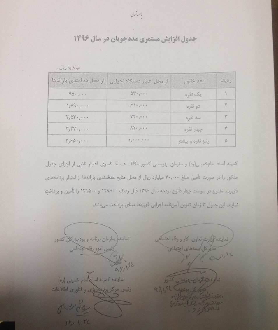 اما اطلاعیه ستاد هدفمندی یارانهها در تاریخ 26 فرودینماه که با تیترهای عجیبی با مضمون «افزایش یارانه محرومان توسط دولت» منتشر شد، نگرانیهایی به وجود آورد؛ در این اطلاعیه آمده بود: «احتراماً، پیرو اطلاعیه قبلی به اطلاع مردم شریف ایران میرساند در راستای اجرای قانون بودجه سال 1396 کل کشور و بهمنظور افزایش حداقل مستمری خانوارهای مددجوی تحت حمایت کمیته امداد امام خمینی(ره) و سازمان بهزیستی کشور مستمری مددجویان مذکور بهصورت علیالحساب بهشرح جدول ذیل افزایش یافته و علاوه بر یارانه پرداختی فروردین ماه در ساعت 24:00 مورخ 1396.01.26 به حساب سرپرستان خانوارها واریز خواهد شد و قابل برداشت خواهد شد.»