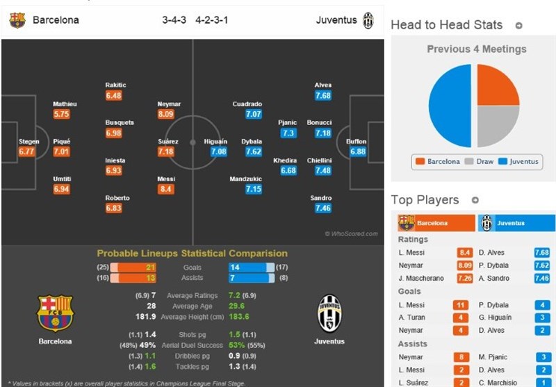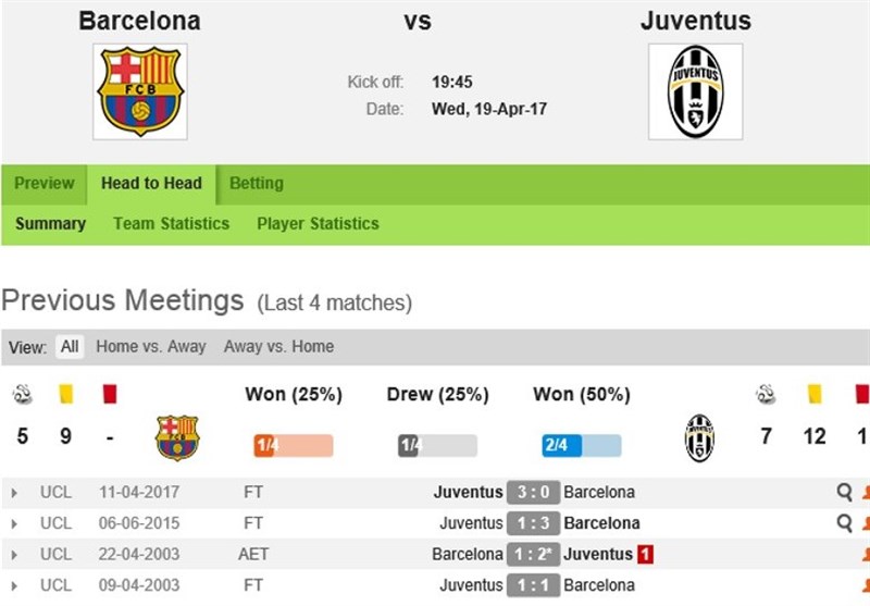 3 پیروزی سهم هر 2 تیم از 8 رویارویی قبلی بوده و طبیعتا 2 بازی هم با تساوی خاتمه یافته است. بارسلونا تنها در صورت کسب بهترین پیروزی تاریخش مقابل یوونتوس توان صعود و حضور در نیمهنهایی را دارد.