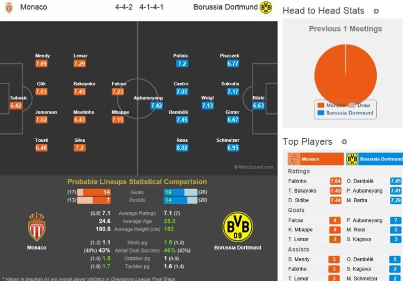 اگر قبل از بازی رفت، انفجار در نزدیکی ورزشگاه دورتموند رخ نمیداد و بارترا مصدوم و بازی به تعویق نمیافتاد، شاید حالا جدال موناکو در خانه باشکوهش، لویی دوم مقابل دورتموند بیرون میدان هم جذاب نمیشد. تدابیر امنیتی نه در پرنسنشین مونتکارلو بلکه در مادرید، لستر و بارسلون هم لحاظ شده اما احتمالا دوبرابر نیروهای امنیتی، بازیکنان دورتموند باید درون زمین مواظب امباپه، ستاره جدید دنیای فوتبال باشند؛ مردی که در بازی رفت برتری 3 بر 2 موناکو در خانه دورتموند را رقم زد تا تیم توخل برای صعود نیاز به زدن 2 گل در زمین موناکو داشته باشد. بازگشت رویس پس از مدت طولانی مصدومیت خبر خوبی برای دورتموند بود اما بارترا کماکان به دلیل حمله توریستی هفته قبل قادر به بازی نیست و علاوه بر او گوتزه و شورله هم توان بازی کردن را ندارند. موناکو، فابینیو را به دلیل محرومیت در اختیار ندارد. سیدبه، بوشلیا و کاریو باید از راه دور نظارهگر تیمشان باشند.