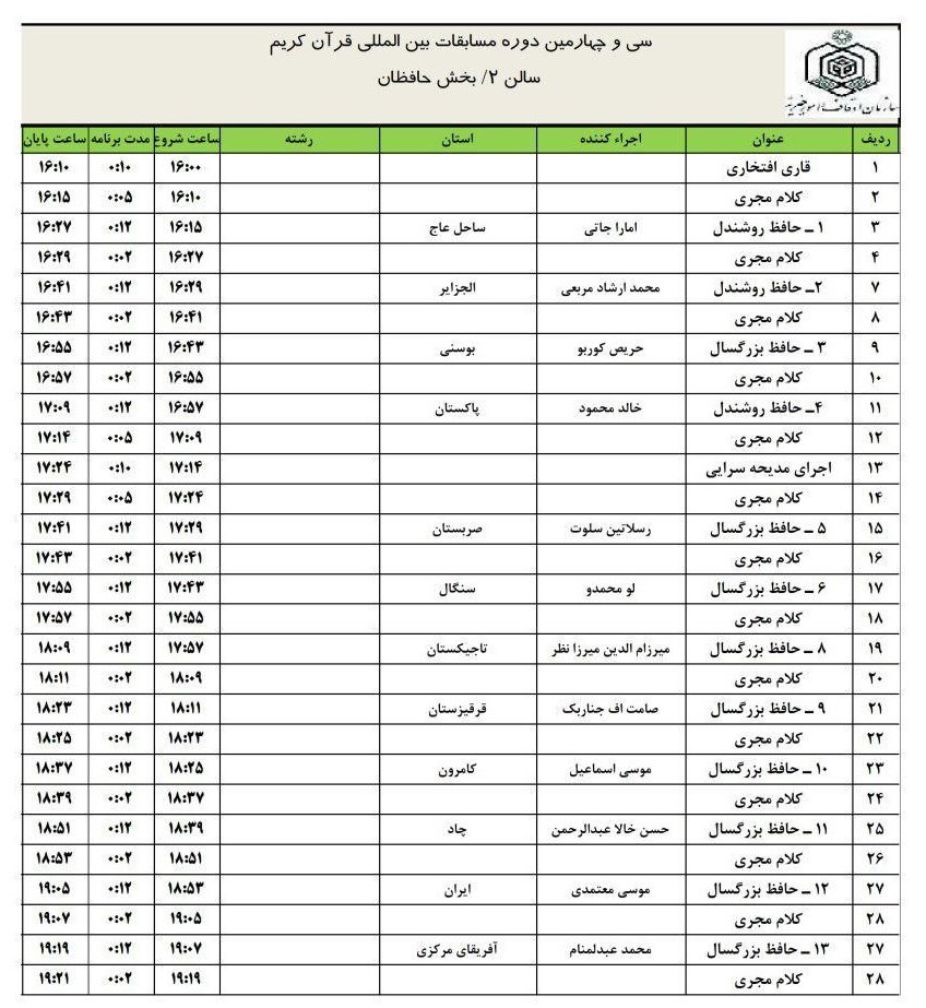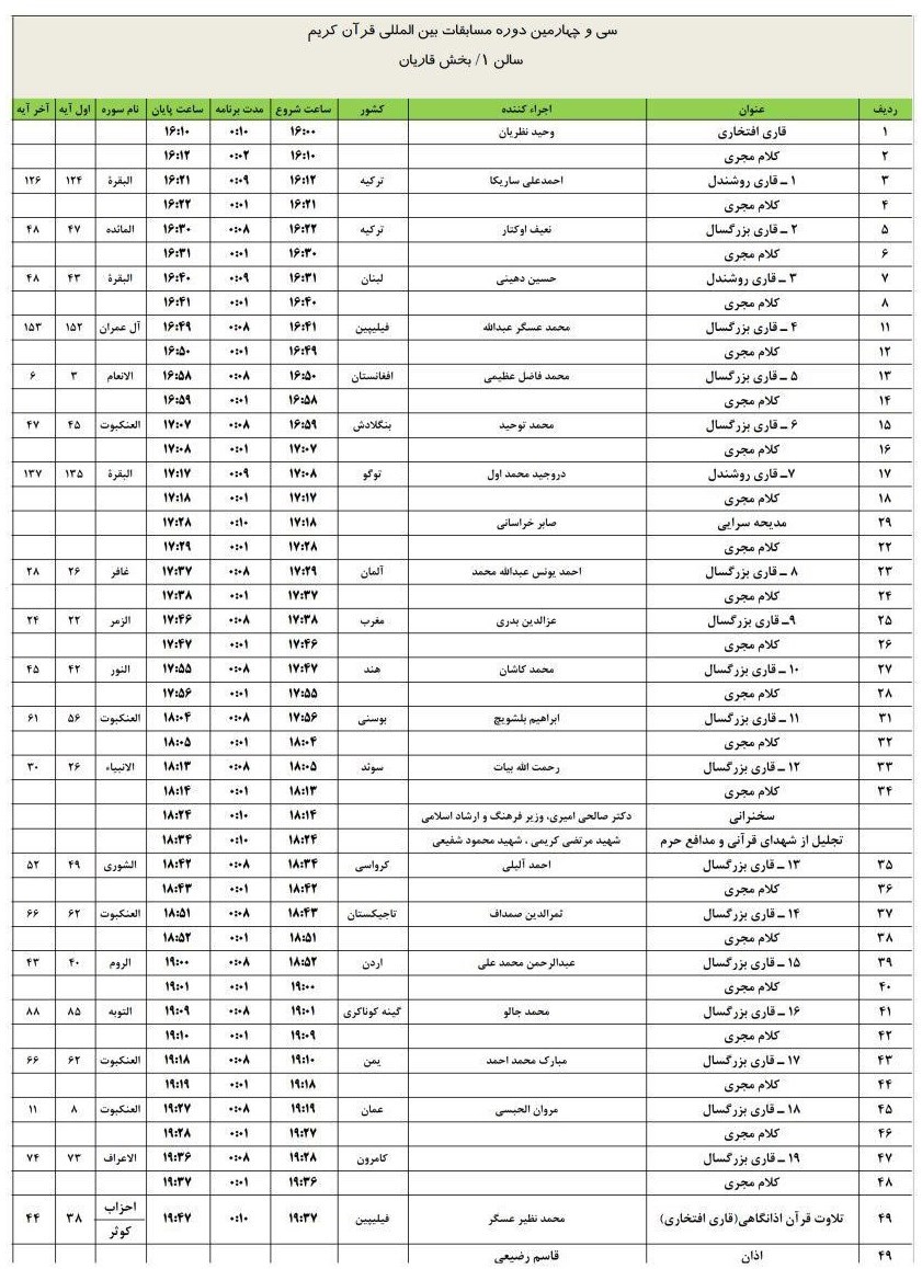 جدول تلاوت حافظان و قاریان در دومین روز از مرحله مقدماتی سی و چهارمین دوره مسابقات بین‌المللی قرآن منتشر شد.