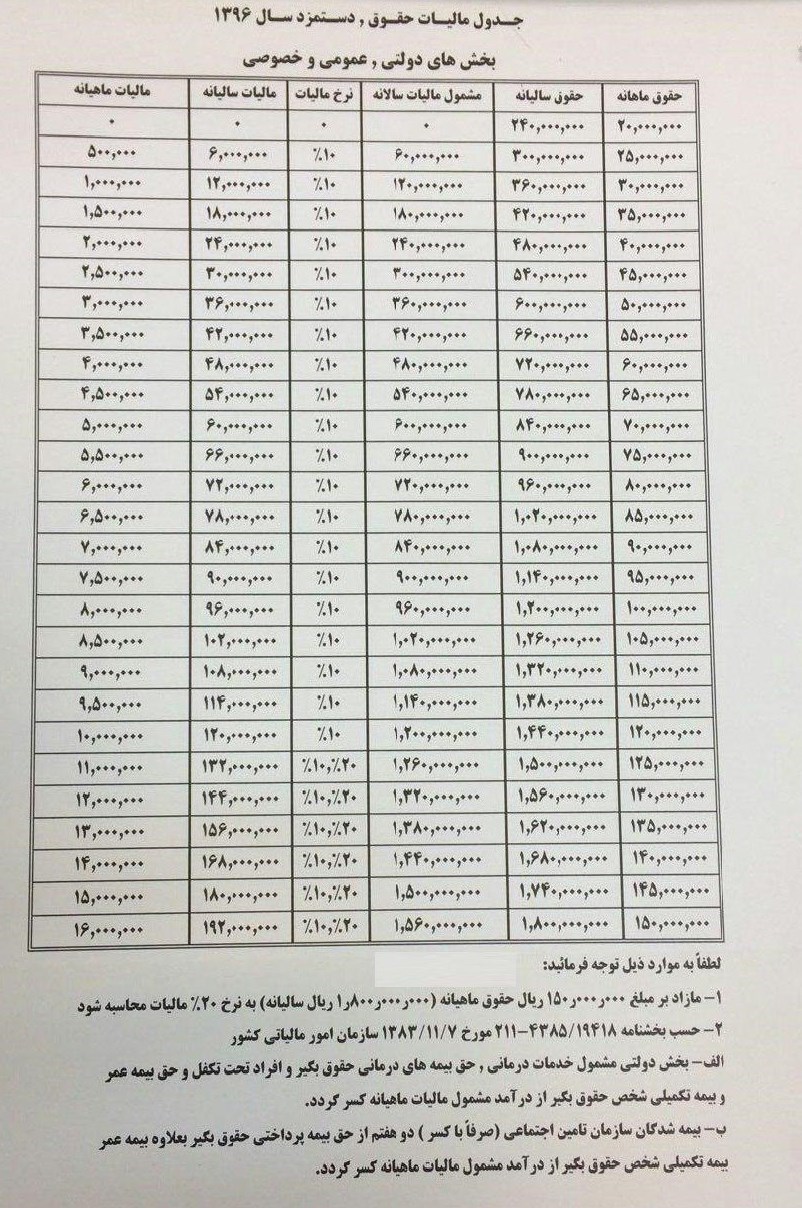 میزان معافیت مالیاتی مواد 57 و 101 قانون مالیاتهای مستقیم مبلغ یکصد و هشتاد میلیون ( 180.000.000 ) ریال تعیین شد. در ادامه جدول مالیات حقوق و دستمزد سال 1396 قابل مشاهده میباشد.