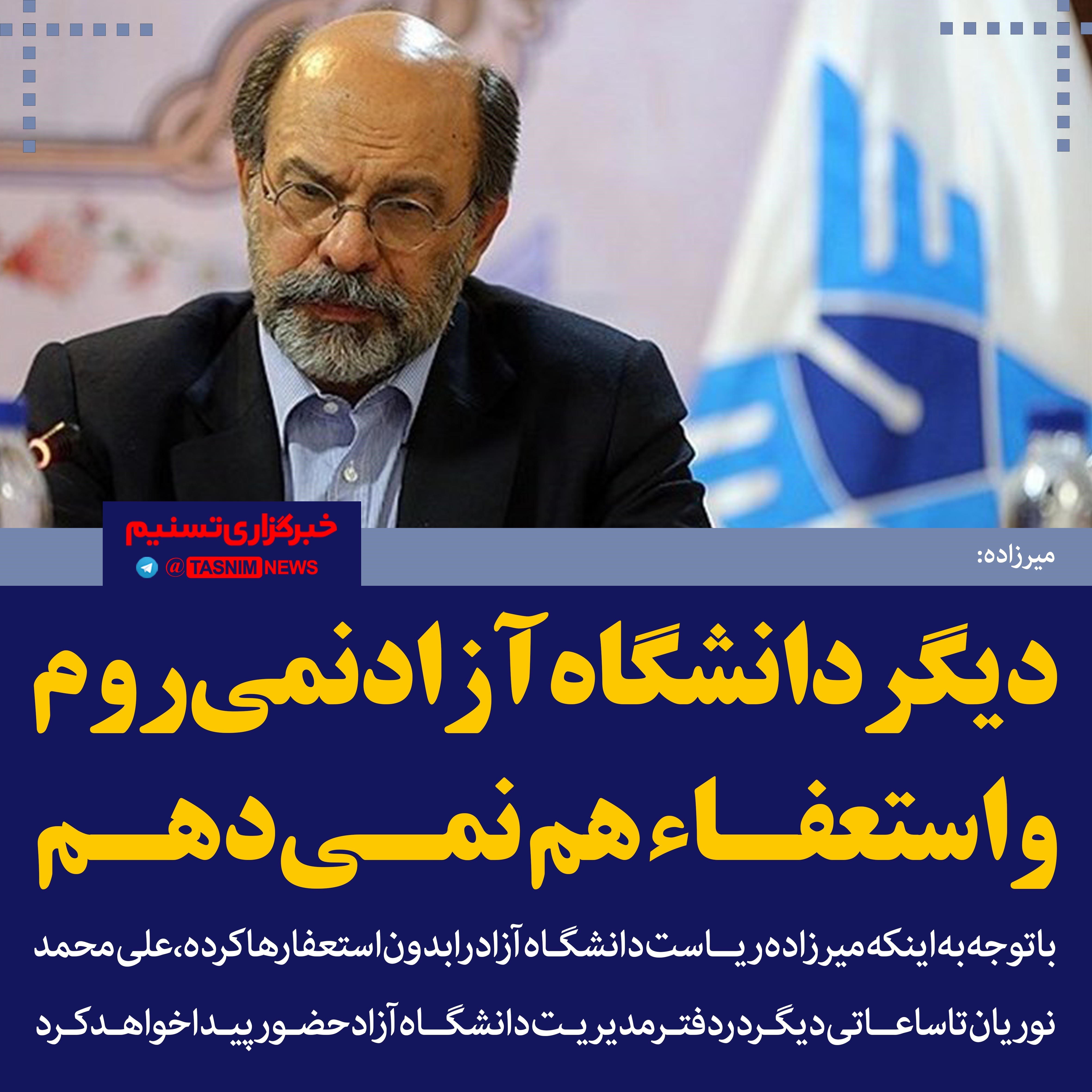 میرزاده روز گذشته در جلسه فوق‌‌العاده هیئت‌امنای دانشگاه آزاد در اعتراض به تصمیم اعضای این هیئت اعلام می‌کند که "دیگر دانشگاه آزاد نمی‌روم و استعفاء هم نمی‌دهم."