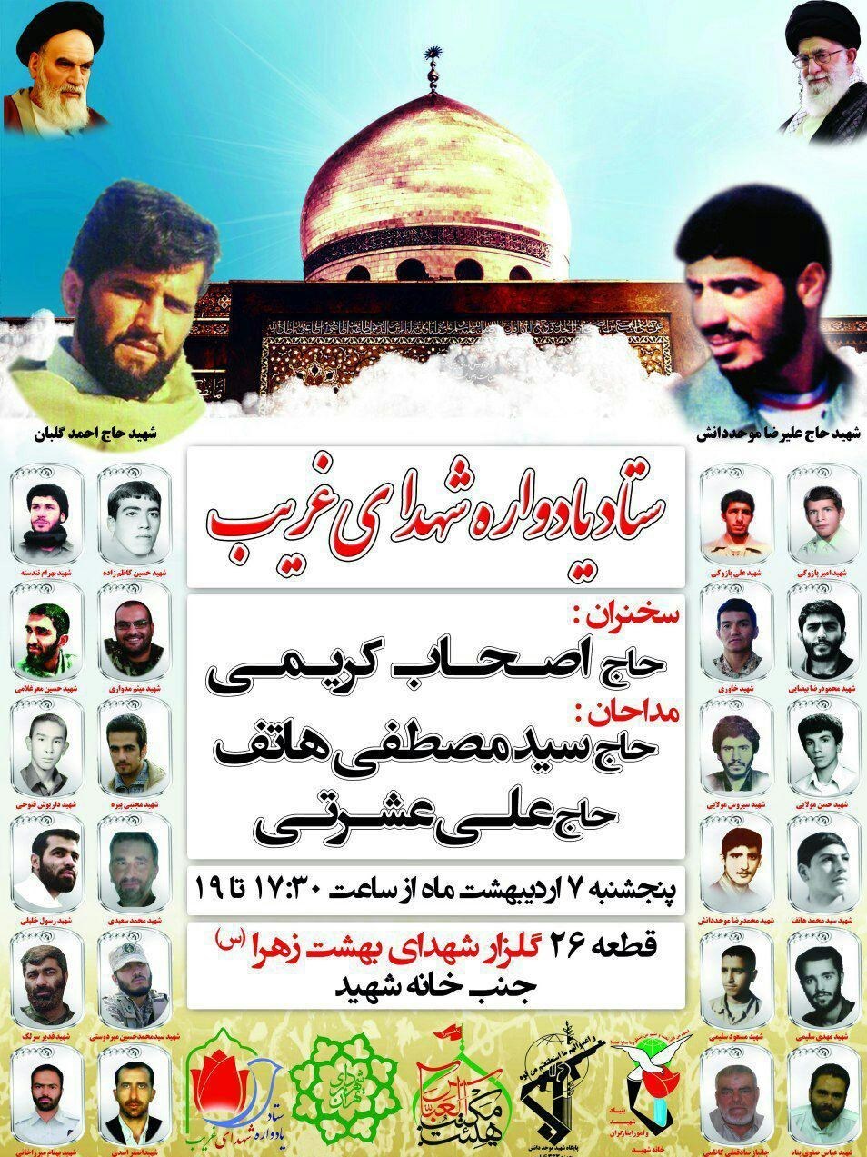 به گزارش خبرنگار فرهنگی باشگاه خبرنگاران پویا, مراسم یادواره شهدای غریب با بزرگداشت سردار شهید علیرضا موحد دانش بنیانگذار لشکر 10 سیدالشهدا(ع) شهید محمد سعیدی از شهدای ترور, شهدای تفحص, شهدای مدافع حرم و شهدای آتشنشان در گلزار شهدای بهشت زهرا(س) برگزار خواهد شد.