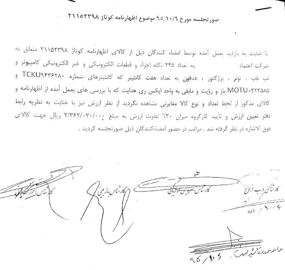 نکته مهم این پرونده آن است که محموله 7کانتینری با هوشیاری مقامات نظارتی، هنگام خروج از گمرک بوشهر در درب خروج توقیف شده و مورد بازبینی قرار گرفته و با ارزیابی مجدد 2 کانتینر در مرحله اول، 230 میلیون تومان مابهالتفاوت ارزش برای صاحب کالا صادر میشود. این موضوع در حالی رخ داده که با توجه به نوع خاص کالا به نظر میرسد بایستی پس از تخلیه، ارزیابی دقیق صورت گیرد اما بر اساس صورتجلسه زیر دو کانتینر از کل محموله مورد نظر، بازرسی شده و پنج کانتینر دیگر برای ارزیابی به قسمت ایکسری منتقل میشود. در ادامه متن صورتجلسه در خصوص محموله 7کانتینری قابل مشاهده است.