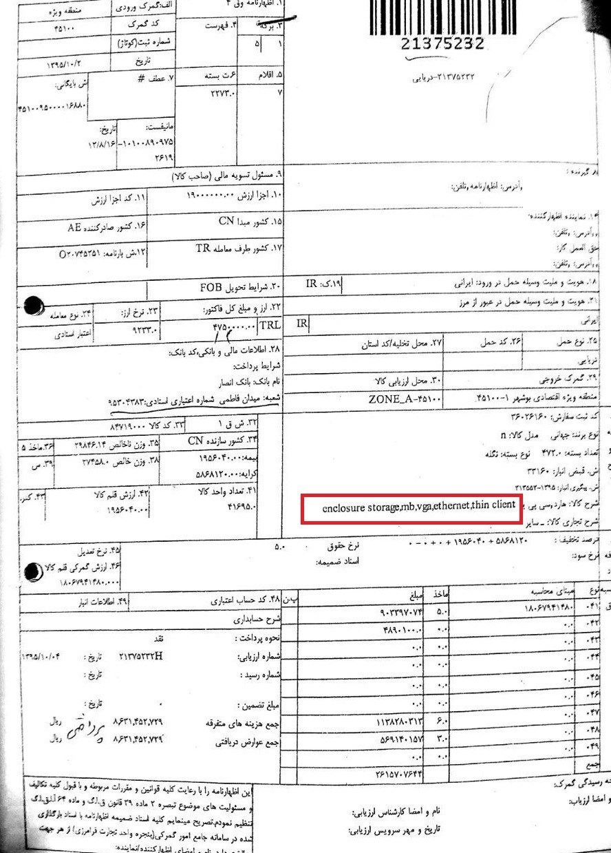 در این خصوص در اواسط دی ماه سخنگوی ستاد مبارزه با قاچاق کالا و ارز با بیان اینکه این محموله با اظهارنامه خلاف واقع وارد کشور شده بود، گفته بود: پس از شناسایی این محموله با همکاری گمرک و پس از توقیف 5 کانتینر محموله مذکور، مأموران وزارت اطلاعات موفق به کشف مقادیر بسیاری «مینیکامپیوتر»، «دوربینهای تصویربرداری سینمایی» که ارزش هریک بین 80 تا 100 میلیون تومان برآورد شد و تعدادی سرورهای عظیم و بسیار پرقدرت شدند که ارزش ریالی هریک از این سرورها بالغ بر 10 میلیارد تومان برآورد شده است.