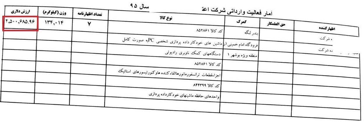 نکته جالب توجه در این خصوص آنکه در همان زمان یک محموله هفتکانتینری توسط یک شرکت با کارت بازرگانی یکبار مصرف (ا.ن.) اظهار شده است. نمونه اظهارنامه این دست تجهیزات رایانهای و آگهی روزنامه رسمی در خصوص تأسیس شرکت مذکور در ادامه قابل مشاهده است.