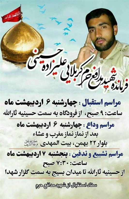 به گزارش تسنیم مراسم تشییع و تدفین پیکر مطهر شهید "علیزاده حسینی" پنجشنبه 7 اردیبهشت ماه جاری ساعت 7:30 صبح از حسینیه ثارالله شهر کرمان به سمت گلزار شهدای کرمان برگزار میشود.