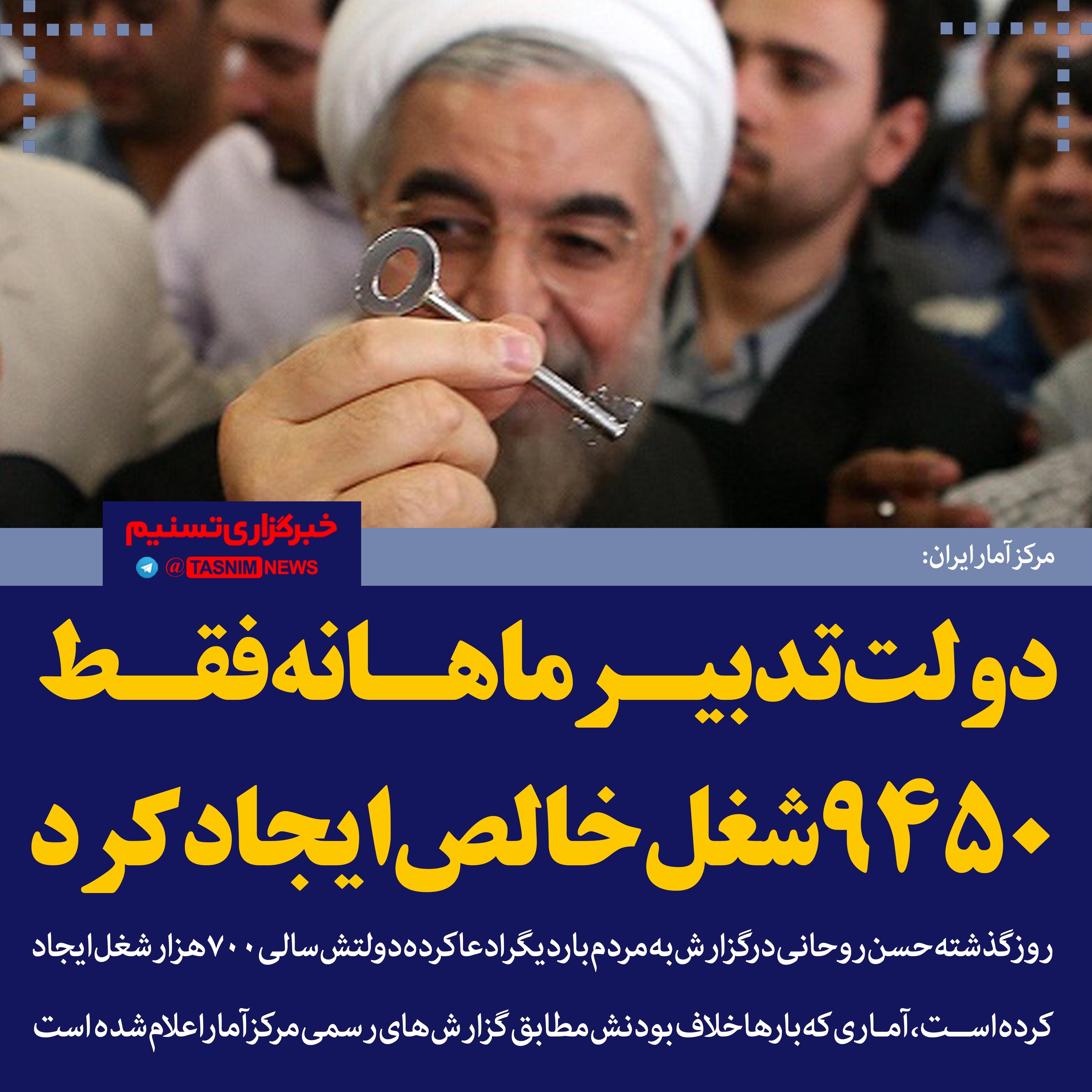 مستندات مرکز آمار ایران نشان می دهد، دولت تدبیر در ایجاد شغل برای مردم ایران با شکست مواجه شده و خالص اشتغالزایی در " دولت بیکاری" ماهانه 9450 شغل بوده است.