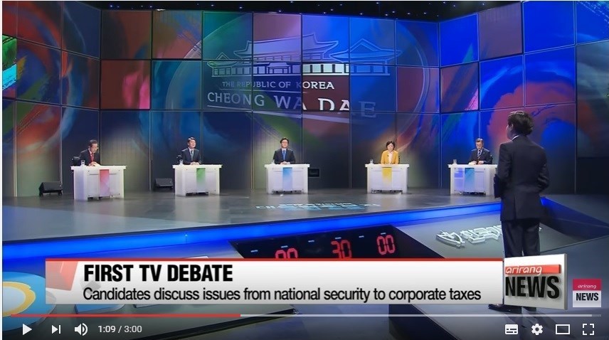 مناظره انتخاباتی کشور کره جنوبی، در این مناظره وجه پررنگ استفاده از تکنولوژی است که با ال سی دی پشت نامزدها به نمایش درآمده است