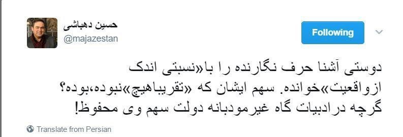 حالا با گذشت یک روز از این سخنان تند آشنا علیه حسین دهباشی، وی به این سخنان مشاور روحانی واکنش نشان داده و "دوستی آشنا حرف نگارنده را با «نسبتی اندک از واقعیت»خوانده. سهم ایشان که «تقریبا هیچ» نبوده، بوده؟ گرچه در ادبیات گاه غیرمودبانه دولت سهم وی محفوظ!"