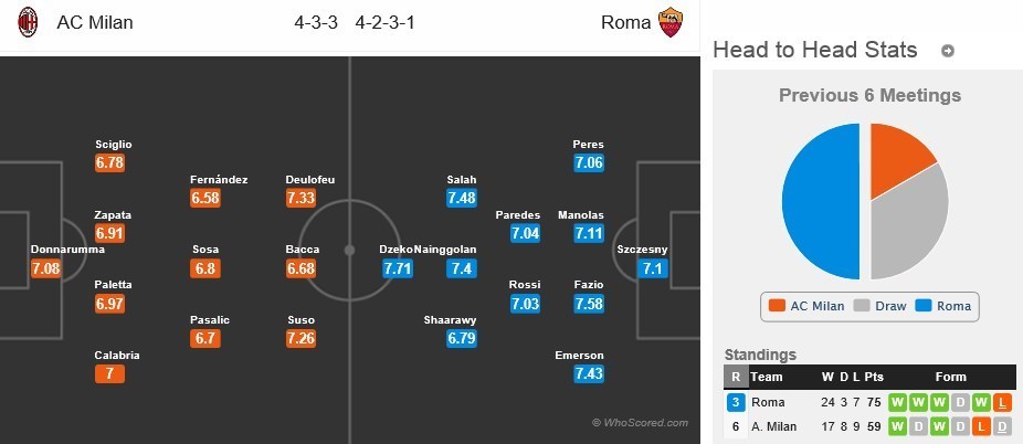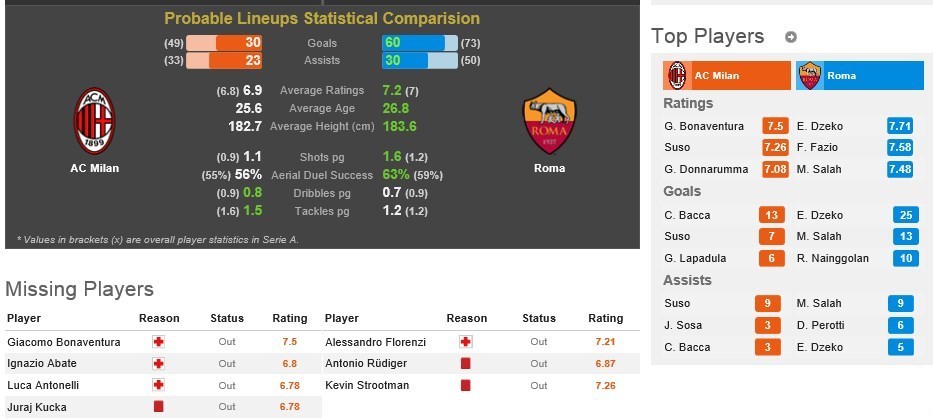 کوتسکا از میلان و رودیگر و استروتمن ( به دلیل محرومیت ناشی ازتلاش برای فریب داور) از رم نمیتوانند تیمهایشان را در این بازی همراهی کنند اما سایر نفرات اصلی 2 تیم در ترکیب حاضر هستند.