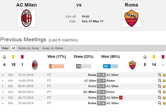 در 34 بازی اخیر، 2 تیم آمار نزدیکی به جا گذاشتند. در این بازه زمانی رم 12 بار و میلان 11 بار پیروز شدهاند و 11 تساوی هم بین رقبا شکل گرفته است.