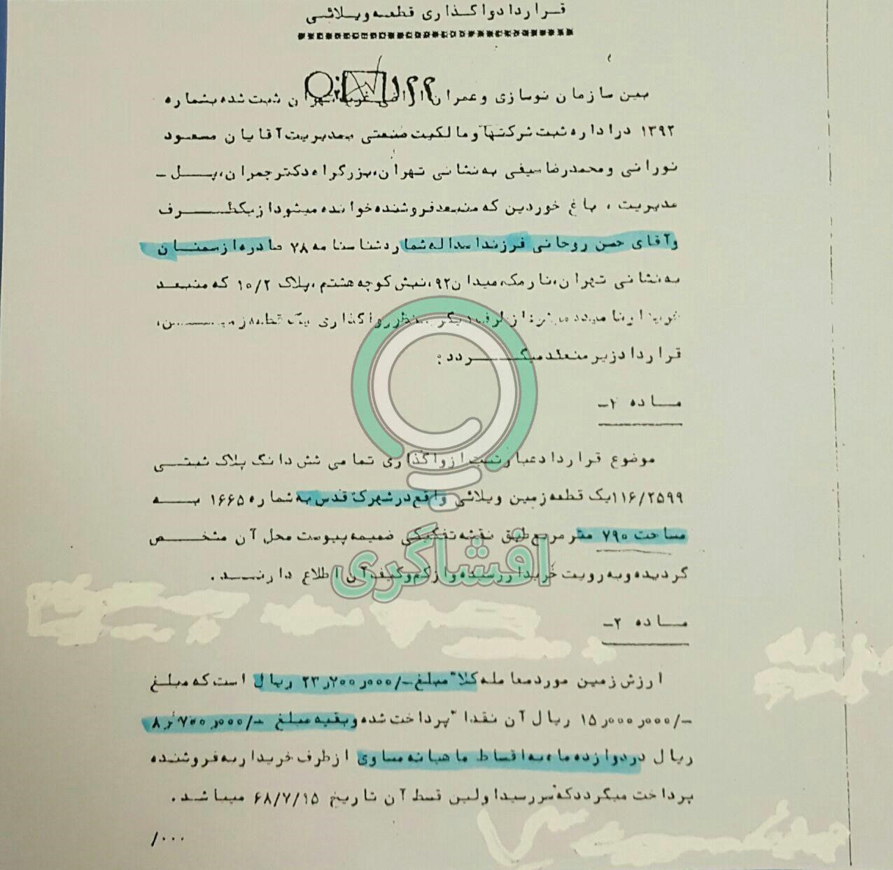 براساس این سند، حسن روحانی رئیسجمهور در سال 68 یک قطعه زمین ویلایی را در شهر قدس(غرب) به مساحت 790 متر به مبلغ 23700000 ریال گرفته است.