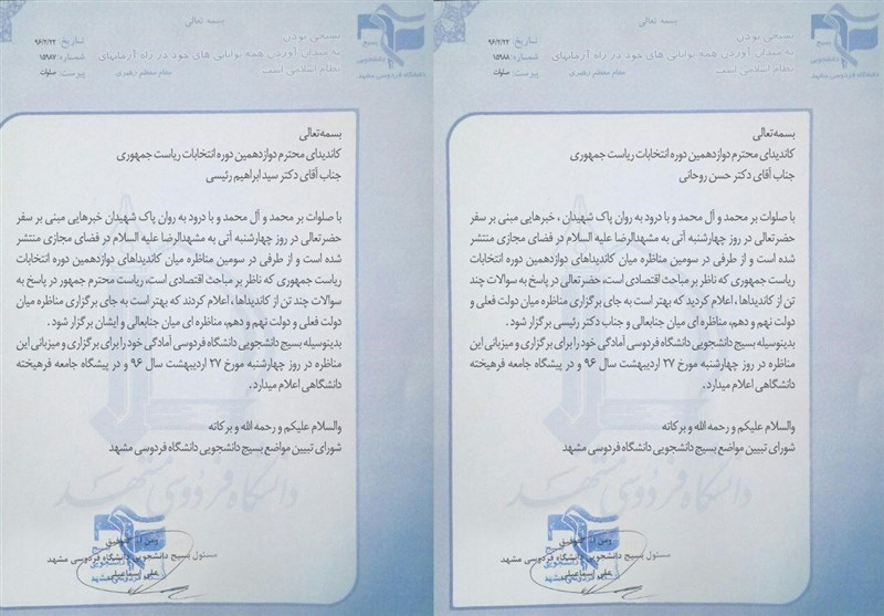 به گزارش خبرگزاری تسنیم از مشهد مقدس، شورای تبیین مواضع بسیج دانشجویی دانشگاه فردوسی مشهد برای برگزاری مناظره میان روحانی و رئیسی کاندیداهای دوازدهمین دوره انتخابات ریاست جمهوری اعلام آمادگی کرد.