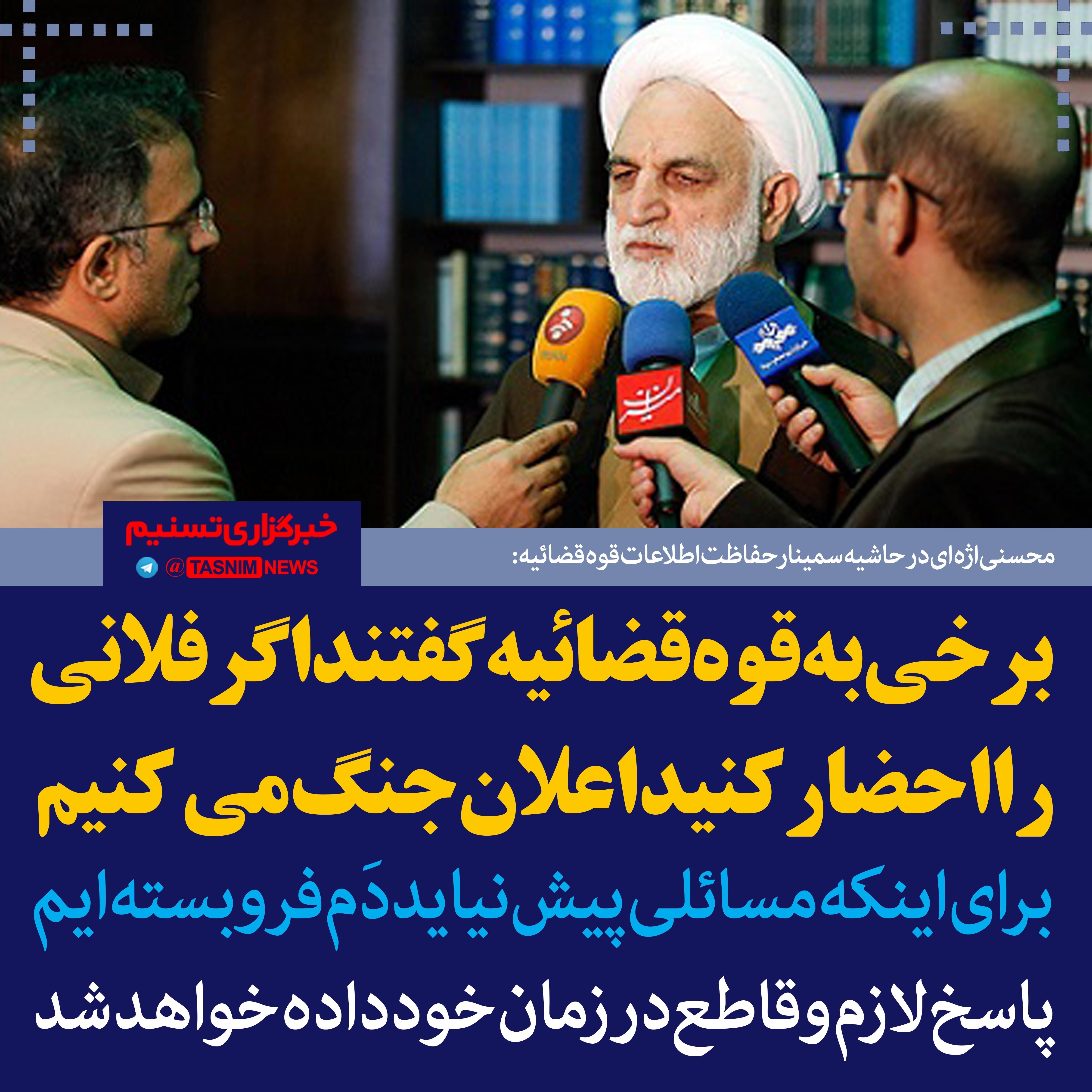 معاون اول قوه‌قضائیه با اشاره به عزم و اراده دستگاه قضایی برای مبارزه با فساد گفت: کسانی گفتند اگر فلان کس را قبل از انتخابات احضار کنید، ما اعلان جنگ می‌کنیم؛ ولی ما تسلیم نشدیم‎.