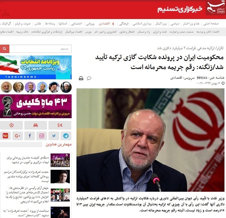 ساعاتی بعد از انتشار این خبر در خبرگزاری تسنیم، شرکت ملی گاز ایران با انتشار بیانیه‌ای رسمی اعلام کرد که هنوز رای دادگاه قطعی نشده و در نتیجه جریمه‌ای هم در کار نیست. سرانجام 16 بهمن ماه 94، وزیر نفت نیز با تأیید رأی دیوان بین‌المللی داوری درباره شکایت ترکیه در واکنش به ادعای غرامت 2 میلیارد دلاری آنها گفت: " این رأی با آن چیزی که ترکیه به‌دنبال آن بوده، متفاوت است. رقم جریمه ایران محرمانه و ناچیز است. "